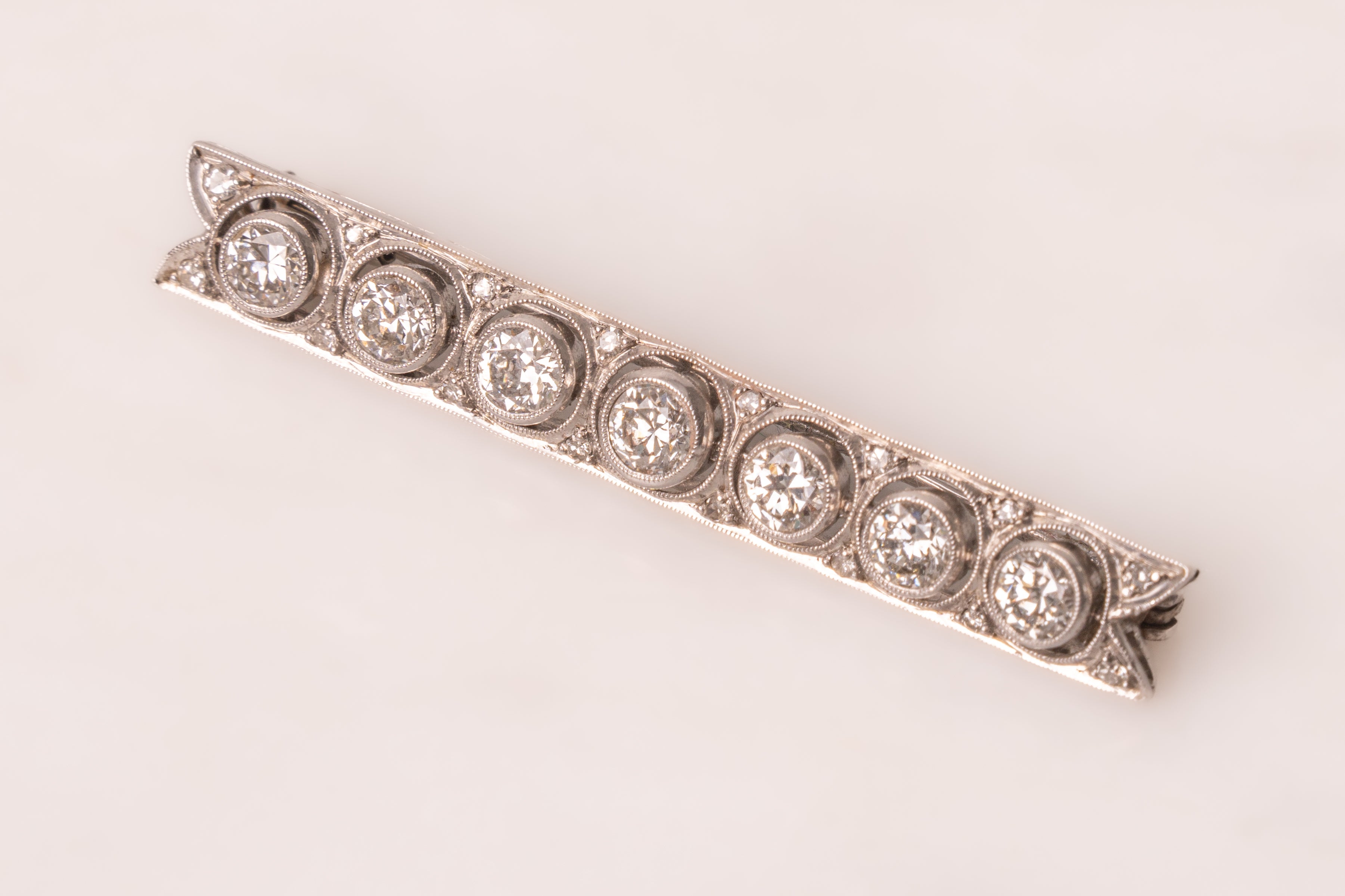 An Early 20th Century diamond brooch with forked ends, set with a line of circular-cut diamonds totalling approximately 1.25 carats, spaced by smaller, single cut diamonds mounted in millegrained platinum, length 4.6cm