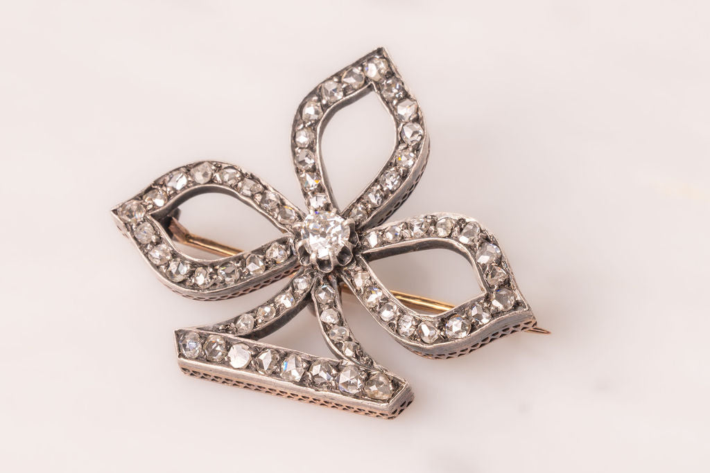 A late 19th Century silver and gold brooch in the design of a Clubs playing card suit. Set with rose-cut and old-cut diamonds, the estimated weight of the old-cut diamond is 0.3 carats, G-H colour, VS clarity.