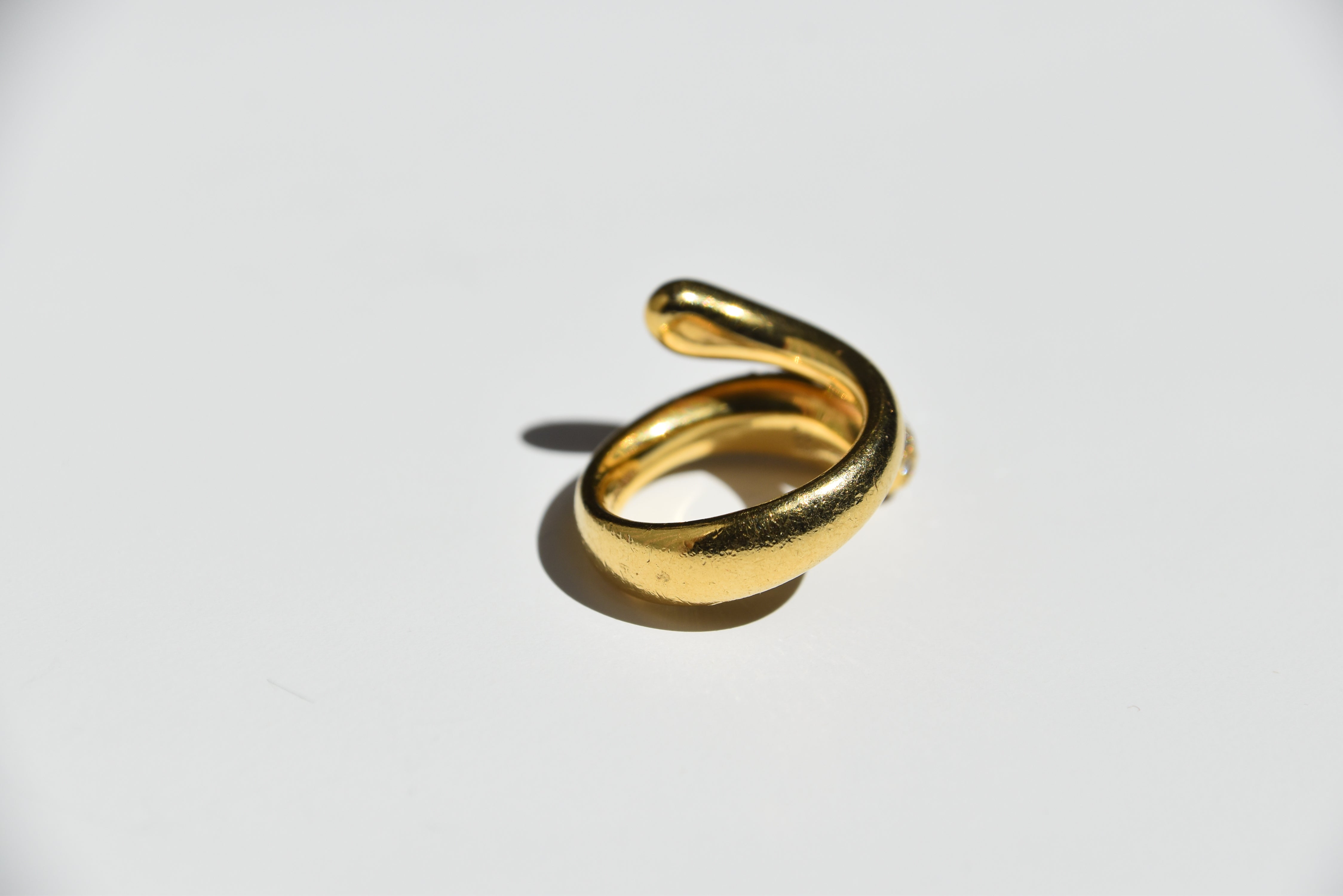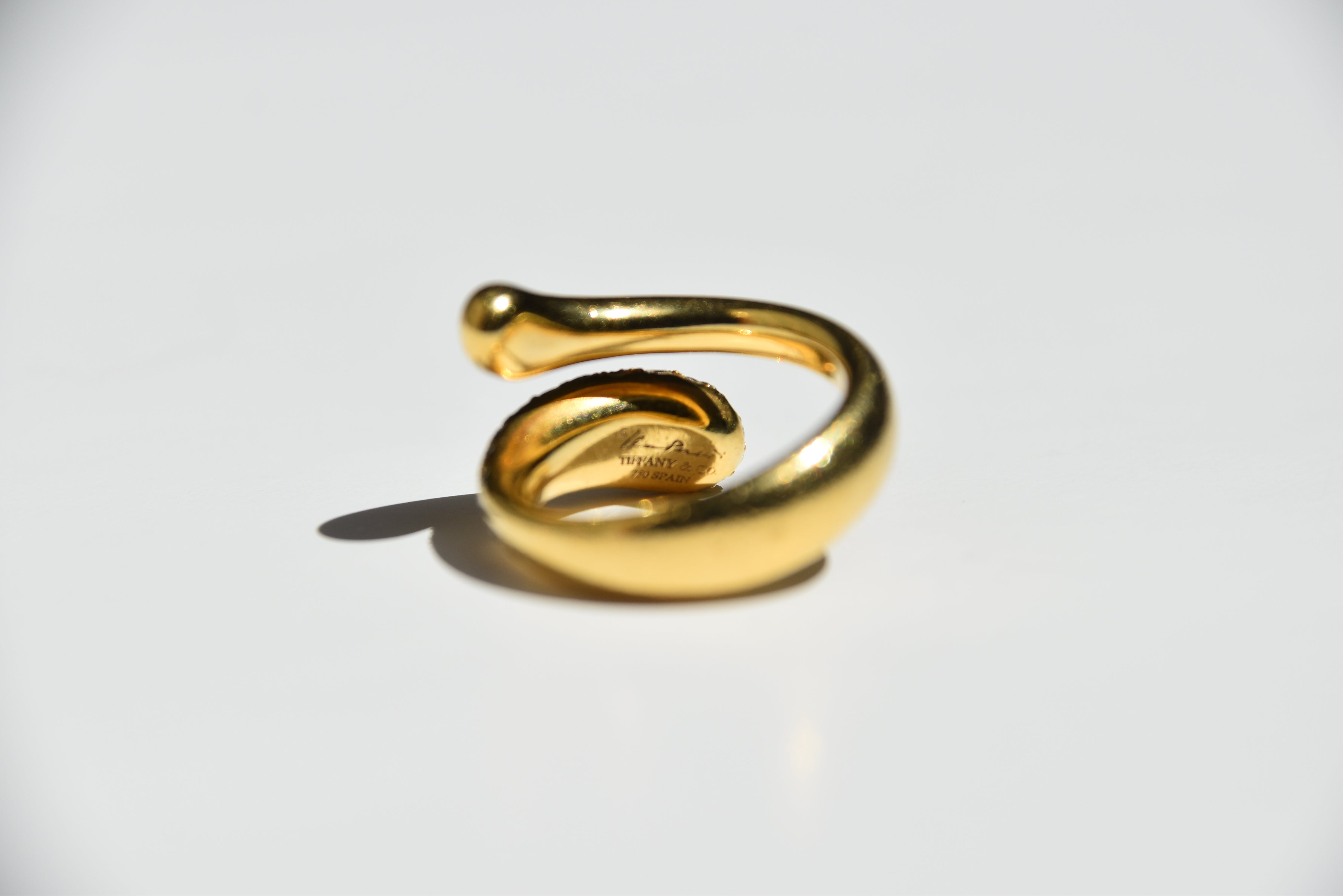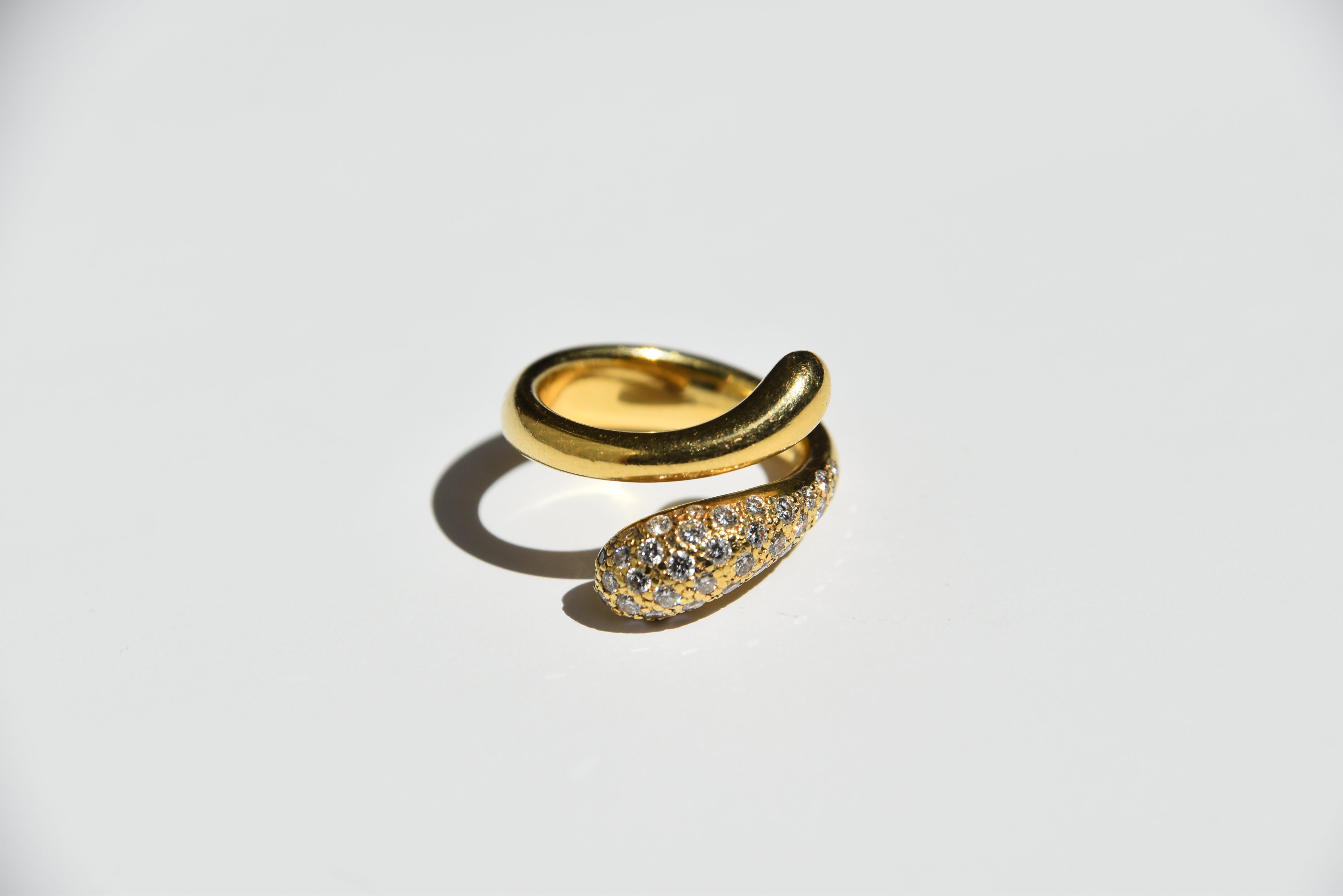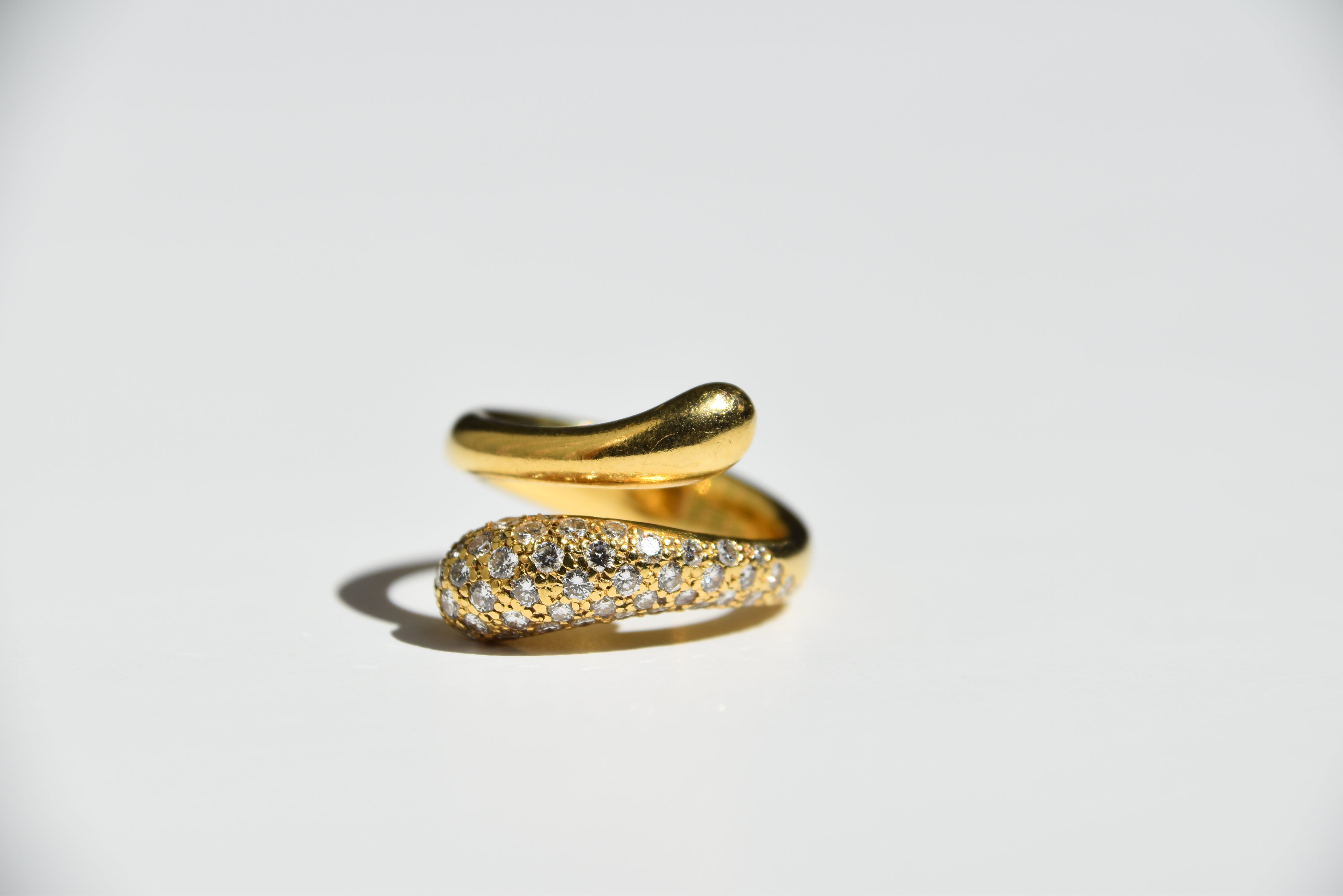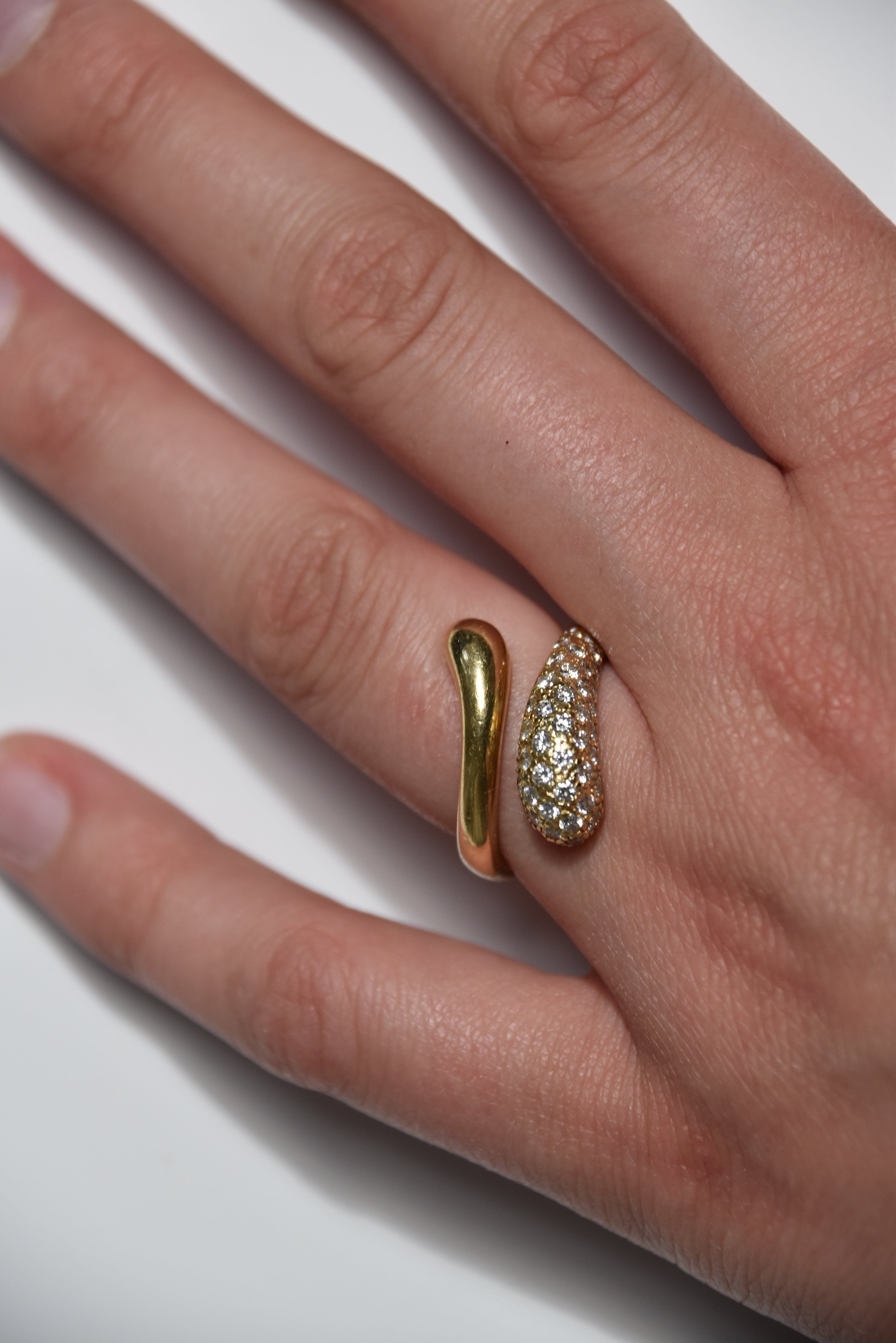 Fluid and free, this ring from Elsa Peretti for Tiffany & Co. has a tasteful design that is quite eye-catching. The ring is made of 18K yellow gold and boasts a twisted teardrop design partially set with a diamond pave.