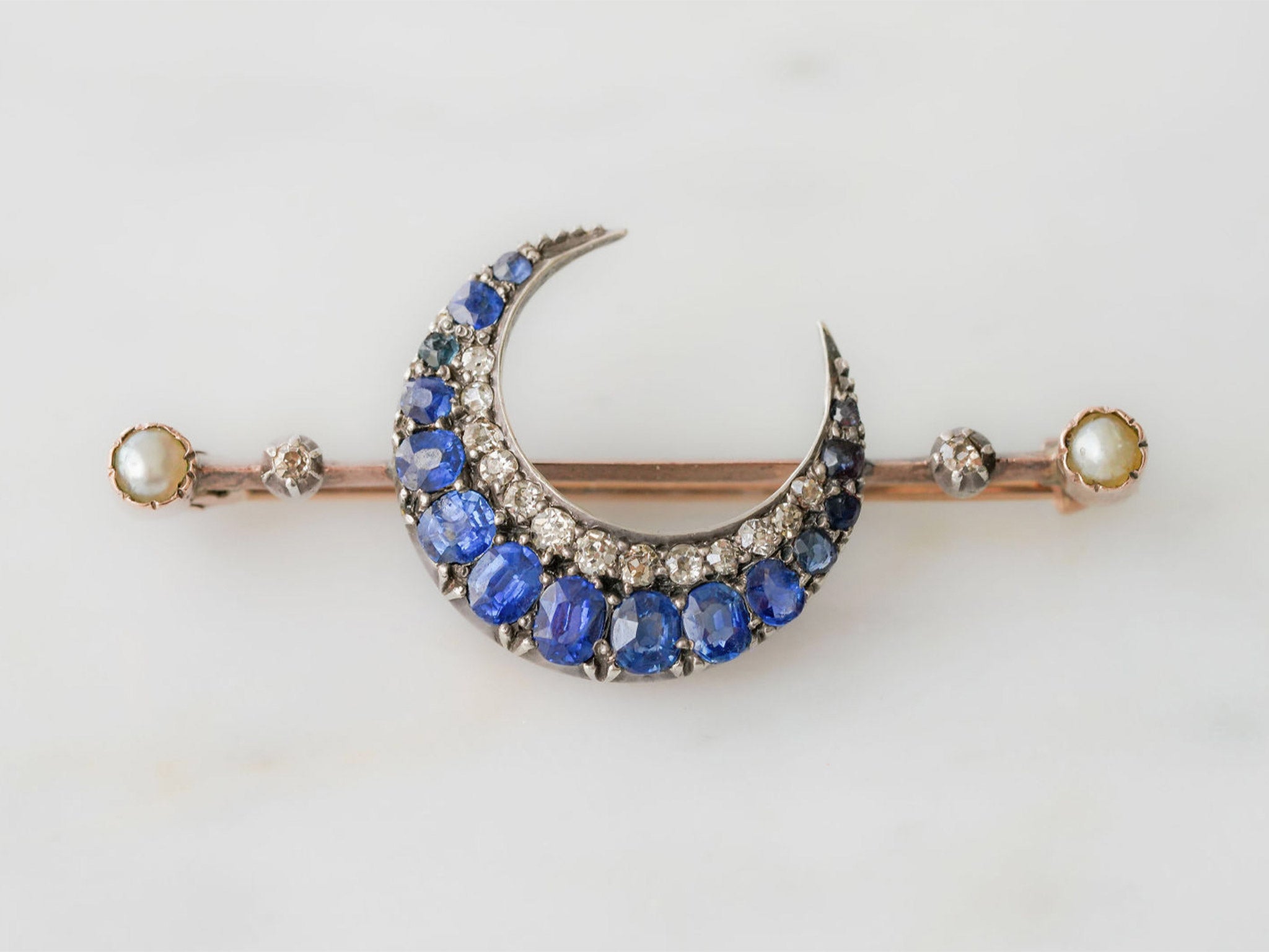 Late Victorian crescent brooch (circa 1890), showcasing 15 vivid oval cut blue sapphires and 15 diamonds in total, set in silver and gold. Adorned with delicate two button pearl accents on a knife-wire bar.
