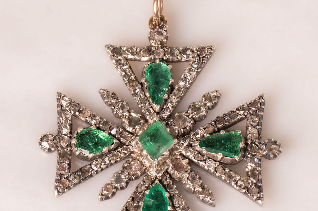 Antique Diamond and Emerald Maltese Cross on a Pearl and Platinum Chain